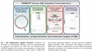 然而,急性髓細胞白血病的z確分類需要不同的技術(shù)來捕獲結(jié)構(gòu)多樣的基因突變,如較大的插入和缺失(indels)、融合基因和除小變異外的結(jié)構(gòu)性染色體變異。此外,結(jié)構(gòu)正?;虻谋磉_水平可對預(yù)后產(chǎn)生決定性影響。因此,在當(dāng)前的技術(shù)平臺下,急性髓細胞白血病診斷及風(fēng)險評估仍然繁瑣、貴,且不完整。為了解決這一需求,我們實施了全轉(zhuǎn)錄組RNA測序(mRNAseq),作為獲取與當(dāng)前和未來分類和風(fēng)險分類相關(guān)的所有遺傳信息的單一平臺。在這種診斷范式中,一個經(jīng)認可的mRNAseq協(xié)議獲取診斷樣本的全面數(shù)據(jù)。對于單次運行數(shù)據(jù)分析,我們開發(fā)了一個指定的集成生物信息管道(人類急性髓細胞白血病快速轉(zhuǎn)錄組學(xué)(HALLET);Fig. 1)。HAMLET具有靈活的適應(yīng)性和個性化,可以查詢一組選定基因的序列變異和表達水平,以及易位情況。