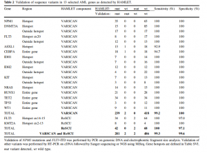 HAMLET的VARSCAN組件在13個AML基因中鑒定出246個小變異體。HAMLET對NPM1和DNMT3A的FLT3-ITD和熱點區(qū)域進行了敏感性評估,對其余的418個被HAMLET稱為野生型的樣本進行了靶向重測序反應(yīng)。VARSCAN只識別了七個相當(dāng)短的FLT3-34人中的ITDFLT3-ITD攜帶AML。在這種情況下,HAMLET都正確地識別了一個ASXL1(3-030)的30bp C末端插入和CEBPA (3-003)中一個N端易位。HAMLET檢測到的小變異體的總體類型和分布與在COSMIC中報告的分布非常一致。