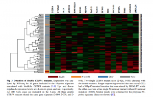 等位基因的CEBPA突變?yōu)楹诵驼5腁ML帶來了良好的預(yù)后并且將一個等位基因上編碼序列的第一個357 bp內(nèi)的N-末端移碼突變與c.834-1074之間的C-末端框內(nèi)插入或缺失相結(jié)合,從而破壞另一個等位基因上的DNA結(jié)合。通過Illumina平臺上通??色@得的reads長度來證明它們在相反染色體上的位置。然而,雙等位基因CEBPA突變與特定的基因表達譜有關(guān)?;趍RNAseq的基因表達譜顯示了特征性的雙等位基因CEBPA攜帶兩個樣本的所有四個急性髓系白血病樣本的突變相關(guān)特征CEBPA突變(2-009、2-039、2-045和3-003),包括其C端突變被HAMLET遺漏的病例3-003(圖3)。11例急性髓系白血病中,有一例CEBPA變異,一個病例(2-025)的特征性N-末端移碼突變與雙聚在一起CEBPA變異。因此,將變異檢測與基因表達譜結(jié)合分析,可以單獨解決變異檢測的不確定性。由于CEBPA 雙突變體的基因標記不是定量的,所以尚未在HAMLET中實施臨床應(yīng)用。