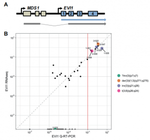 Fig. 5 Detection of EVI1 overexpression. a Schematic representation of two mRNA transcripts from the MECOM locus on chromosome 3. One transcript contains exon 1–2 of MDS1 fused to exon 2–15 of EVI1 (MDS1-EVI1 transcript), whereas the other transcript contains exon 1–15 of EVI1 (EVI1 transcript). b Comparison of EVI1 expression by RNAseq and quantitative RT-PCR. Xaxis: Expression of the first exon of EVI1 normalized for expression of the PBGD housekeeping gene by quantitative RT-PCR (log2 EVI1/PBGD). Y-axis: Sum of base coverage of the first exon of EVI1 per kb transcript and one million mapped reads (log2 BPKM) by RNAseq