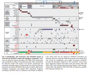 根據(jù)HAMLET和中期核型分析結(jié)果,99例病例可根據(jù)世衛(wèi)組織2016年和基因組分類進行重新分類(圖6)。HAMLET信息促進了6個案例的風(fēng)險重新評估,值得注意的是通過NUP98-NSD1融合而無分類明確病變的AML,或通過EVIl過表達而無inv(3)(q21q26)來分配風(fēng)險。