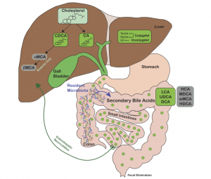 初級(jí)膽汁酸進(jìn)入腸粘膜后,會(huì)產(chǎn)生50多種不同的次級(jí)膽汁酸。膽汁酸的化學(xué)多樣化是宿主(產(chǎn)生初級(jí)膽汁酸)和腸道微生物群(產(chǎn)生次級(jí)膽汁酸)共同努力的結(jié)果。最近,人們對(duì)腸道微生物-膽汁酸-宿主軸的研究正在擴(kuò)展到包括胃腸學(xué)、內(nèi)分泌學(xué)、腫瘤學(xué)和傳染病在內(nèi)的多個(gè)領(lǐng)域。[1]