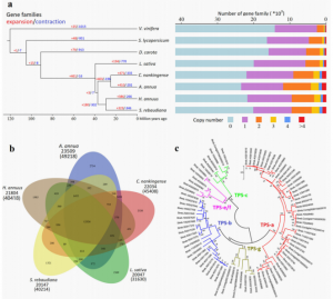 物種演化過程中,往往伴隨著基因家族的擴張與收縮,基因家族(gene family)是來源于同一個祖先,由一個基因通過基因重復(fù)而產(chǎn)生兩個或更多的拷貝而構(gòu)成的一組基因,它們在結(jié)構(gòu)和功能上具有明顯的相似性,編碼相似的蛋白質(zhì)產(chǎn)物。而特定基因家族的擴張可能在促進植物表型多樣化和新性狀進化中發(fā)揮重要作用。通過與具有相似/相反生物學(xué)功能的近緣物種比較,獲得相關(guān)基因家族,并將選擇其中某種擴張基因家族聯(lián)合轉(zhuǎn)錄組差異表達以及代謝組,可以深度挖掘目的物種重要性狀形成機制與重要代謝通路。該研究方法是中藥、花卉、蔬果等植物研究中的重要環(huán)節(jié)。