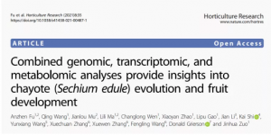 主要內(nèi)容:本研究通過Nanopore技術(shù)首次完成高質(zhì)量的佛手瓜基因組,基因組組裝大小為606.42Mb,ContigN50=8.4 Mb。并基于Hi-C技術(shù)將基因組序列掛載至14條染色體上(掛載率97.04%)。通過與其他13個物種基因家族比較,發(fā)現(xiàn)佛手瓜在25±4百萬年間發(fā)生了一次全基因組復(fù)制事件,是葫蘆科內(nèi)的第三次全基因組復(fù)制事件。通過不同生長時期的轉(zhuǎn)錄組與代謝組分析,進一步揭示了在佛手瓜果實發(fā)育過程中與果實質(zhì)地、色素、風(fēng)味、類黃酮、抗氧化劑和植物激素有關(guān)的基因。并據(jù)此構(gòu)建了佛手瓜果實生長發(fā)育調(diào)控模型,并為佛手瓜果實和塊莖發(fā)育以及遺傳改良的未來研究奠定了基礎(chǔ)。
