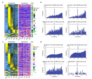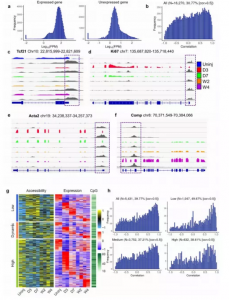 然后根據(jù)檢測(cè)到的啟動(dòng)子的可及性對(duì)它們進(jìn)行分類:高可及性組,低可及性組和動(dòng)態(tài)可及性組。發(fā)現(xiàn)在三個(gè)組中,很多基因的啟動(dòng)子可及性和轉(zhuǎn)錄水平有很強(qiáng)的相關(guān)性,但是在高可及性組中有一些基因的啟動(dòng)子可及性和轉(zhuǎn)錄組水平有著較弱的或者無相關(guān)性。有趣的是,具有高啟動(dòng)子可及性的基因具有最高的CpG密度,而具有低啟動(dòng)子可及性的基因具有最低的CpG密度(圖4g)。當(dāng)根據(jù)啟動(dòng)子中的CpG密度將5,431個(gè)差異表達(dá)基因分為3組時(shí),發(fā)現(xiàn)CpG密度較低但具有很強(qiáng)的正相關(guān)性的基因占比最高,進(jìn)一步表明DNA甲基化可以獨(dú)立調(diào)控基因轉(zhuǎn)錄,而與啟動(dòng)子染色質(zhì)可及性無關(guān)(圖4h)。