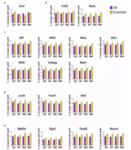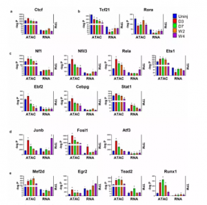 接下來分析每個(gè)分組中這17個(gè)TF motif在遠(yuǎn)端ATAC-seq 峰中的結(jié)合位點(diǎn),發(fā)現(xiàn)與未受傷組相比,對(duì)應(yīng)的靶基因在MI后的分組樣本的心臟成纖維細(xì)胞中是上調(diào)的。分析結(jié)果說明除了Ctcf,大多數(shù)MI后的分組樣本中的TF motif在遠(yuǎn)端ATAC-seq峰對(duì)應(yīng)的上調(diào)靶基因區(qū)域中的富集程度高于所有遠(yuǎn)端ATAC-seq峰(圖7a-e)。