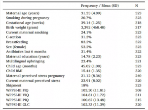 380個(gè)樣本中有364個(gè)成功進(jìn)行了微生物菌群分析(圖1)。在隨后的統(tǒng)計(jì)分析中,排除了一名孕齡較晚的受試者、35名WPPSI-III量表測(cè)試方法不準(zhǔn)確的受試者以及5名運(yùn)輸/儲(chǔ)存不規(guī)范的受試者,共323名受試者。對(duì)于其余的家庭,記錄人口統(tǒng)計(jì)資料(母親年齡、兒童年齡、性別),產(chǎn)前、產(chǎn)期和產(chǎn)后因素(胎齡、出生體重、吸煙情況、剖腹產(chǎn)、母乳喂養(yǎng)、母親教育、多語(yǔ)言教育、兒童的BMI、抗生素使用情況)以及認(rèn)知水平(WPSSI-III 總智商(FIQ),言語(yǔ)智商(VIQ)、操作智商(PIQ)和通用語(yǔ)言組合(GLC))(表1)。