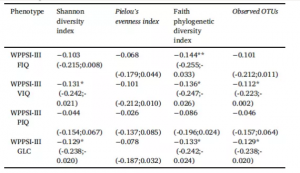 阿爾法多樣性指標(biāo)與認(rèn)知水平之間存在顯著負(fù)相關(guān)。如表3所示,F(xiàn)aith系統(tǒng)發(fā)育多樣性指數(shù)與WPPSI-III FIQ之間的顯著關(guān)聯(lián)。同時(shí)發(fā)現(xiàn)抗生素的使用與Shannon多樣性指數(shù)和Pileou均勻度呈負(fù)相關(guān),妊娠期與Shannon多樣性指數(shù)和觀測(cè)到的物種數(shù)呈負(fù)相關(guān),以及C-section與Faith的系統(tǒng)發(fā)育多樣性指數(shù)呈現(xiàn)正相關(guān)(圖S1)。