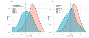 隨后對(duì)腸桿菌科內(nèi)的未知屬進(jìn)行了另外的分析,發(fā)現(xiàn)與母親年齡和吸煙與否幾個(gè)協(xié)變量是相關(guān)的。尤其是和孕婦在懷孕期間吸煙和T4時(shí)期吸煙(圖3B)相關(guān)性更為明顯。中介分析(圖3)表明腸桿菌科中該屬介導(dǎo)了孕婦妊娠期間吸煙和當(dāng)前吸煙對(duì)WPPSI-III FIQ的影響。