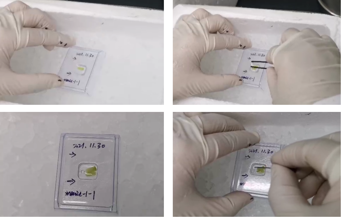 將包埋盒(冷凍切片OCT包埋盒,7x7x5mm)放置在冰上,標(biāo)記包埋盒(組織放置的方向、樣品名稱等)(可拍照記錄),在包埋盒底部加入適量的OCT包埋劑(美國櫻花OCT冷凍切片包埋劑SAKURA ,貨號:4583,規(guī)格:118 mL/瓶),約1/4深度,微凝固后待用,防止組織沉底直接接觸包埋盒底部;