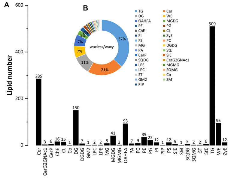 1. 本研究對冀麥22號低蠟突變體和多蠟突變體的葉表皮蠟進行了非靶向脂質(zhì)體檢測和轉(zhuǎn)錄組分析。共鑒定出31個脂類亞類和1,367個脂類分子。