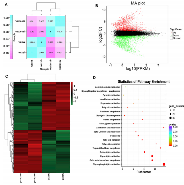 此外,我們注釋了3659個DGE的脂質(zhì)功能,篩選了343個DGE,并使用KEGG富集分析對其進行富集(圖2C,D)。研究發(fā)現(xiàn),這些基因主要集中在甘油磷脂代謝、角質(zhì)層、亞油酸和蠟的生物合成、甘油脂代謝、鞘脂代謝、萜類主干生物合成、脂肪酸降解和脂肪酸伸長途徑中,這與該研究中控制小麥葉片光澤表型的主要脂質(zhì)組分一致。