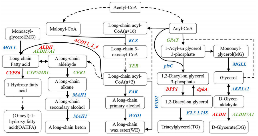 在OAHFA合成過程中,?;o酶A硫代酯酶1/2/4基因(ACOT1_2_4)的上調(diào)表達促進長鏈脂肪酸的合成,而?;视椭久富颍∕GLL)的表達水平在單?;视娃D(zhuǎn)化為長鏈脂肪酸的過程中上調(diào)和下調(diào)。醛脫氫酶家族7個成員A1基因(ALDH7A1)表達下調(diào)抑制了A長鏈醛與長鏈脂肪酸之間的過渡,醛脫氫酶基因(ALDH)則上調(diào)了A長鏈醛與長鏈脂肪酸之間的過渡。在長鏈脂肪酸轉(zhuǎn)化為ω-羥基脂肪酸的過程中,長鏈脂肪酸ω-單加氧酶基因(CYP704B1)的表達下調(diào),而突變無蠟脂肪酸ω-羥化酶基因(CYP86)的表達上調(diào)。甘油-3磷酸酰基轉(zhuǎn)移酶基因(GPAT)和ALDH7A1在DG、MG和TG的甘油酯代謝過程中下調(diào)。在無蠟情況下,葡萄糖的表達下調(diào)抑制了1-?;?sn甘油3-磷酸的合成,從而減少了鎂的合成。ALDH7A1在低蠟突變體中的下調(diào)表達降低了DG的合成。上調(diào)基因為ALDH、二酰甘油二磷酸磷酸酶基因(DPP1)和二酰甘油激酶基因(dgkA),而1-?;?SN-甘油-3-磷酸?;D(zhuǎn)移酶基因(plsC)的表達為磷脂:酰甘油?;D(zhuǎn)移酶基因(E2.3.1.158)、MGLL和酒精脫氫酶基因(AKR1AI)均上調(diào)和下調(diào)。這些基因共同作用降低低蠟突變無蠟細胞中TG的含量。