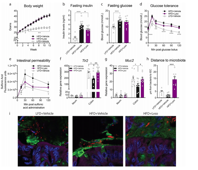 該文章首先研究了溶菌酶對飲食誘導(dǎo)型肥胖小鼠的潛在影響。研究結(jié)果發(fā)現(xiàn),與喂食LFD的小鼠相比,喂食HFD的小鼠體重增加了更多,每天補(bǔ)充溶菌酶對身體成分或能量攝入沒有產(chǎn)生可測量的影響(圖1a),然而,接受溶菌酶治療的小鼠確實(shí)表現(xiàn)出了更低的空腹胰島素水平(圖1b)。與Vehicle+HFD組相比,溶菌酶更傾向于降低餐后血糖而不是空腹血糖。葡萄糖刺激的胰島素濃度不受溶菌酶補(bǔ)充的影響。與已知可以調(diào)節(jié)腸道滲漏的空腹胰島素減少類似,本文研究者們在溶菌酶灌胃的動(dòng)物中觀察到HFD誘導(dǎo)的腸道通透性出現(xiàn)數(shù)值保護(hù)(圖1e)。這些體內(nèi)跡象表明HFD喂養(yǎng)的小鼠腸道通透性增加,且循環(huán)LPS、腸炎癥以及與結(jié)腸和回腸緊密連接基因的表達(dá)在組間保持相似。盡管如此,溶菌酶還是使HFD誘導(dǎo)的結(jié)腸中Tlr2表達(dá)的減少維持在正常范圍內(nèi)(圖1f)。根據(jù)已有研究顯示,TLR2的激活與結(jié)腸杯狀細(xì)胞的黏液調(diào)節(jié)有關(guān),因此本文研究者們調(diào)查了黏液的產(chǎn)生,發(fā)現(xiàn)補(bǔ)充溶菌酶可防止HFD誘導(dǎo)的結(jié)腸Muc2下調(diào)(圖1g)。進(jìn)一步的,發(fā)現(xiàn)這種溶菌酶介導(dǎo)的黏液完整性保存,可能是由于腸上皮細(xì)胞到最近細(xì)菌的平均距離增加6倍以上導(dǎo)致,從而說明補(bǔ)充溶菌酶足以防止HFD引起的微生物區(qū)系侵蝕(圖1h-i)。