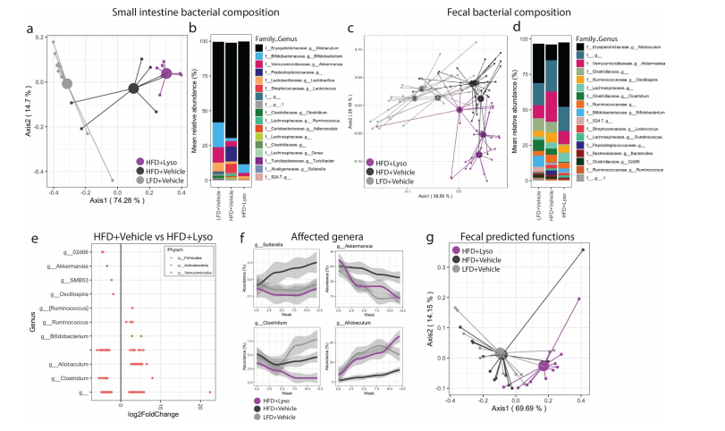 由于微生物區(qū)系侵蝕的減少也可能由于溶菌酶具有潛在的殺菌活性,因此本文研究者接下來評估了實(shí)驗(yàn)小鼠糞便微生物群的縱向變化。在研究開始時(shí),所有的小鼠都低脂喂養(yǎng),且微生物組成分析顯示這些小鼠的微生物組成具有相似性。HFD喂養(yǎng)導(dǎo)致了小腸和糞便樣本中的微生物群組成產(chǎn)生了巨大差異(圖2a-d)??v向抽樣顯示,飲食干預(yù)導(dǎo)致糞便微生物群發(fā)生即時(shí)變化,而溶菌酶給藥的影響逐漸顯現(xiàn)。與其他組相比,每天接受口服溶菌酶的小鼠,其微生物群落在結(jié)構(gòu)上表現(xiàn)出獨(dú)特和漸進(jìn)的軌跡(圖2c)。但盡管如此,除在小腸中,一些HFD誘導(dǎo)的糞便微生物變化可以通過補(bǔ)充溶菌酶來抵抗(圖2a-f)。微生物群的alpha多樣性不受溶菌酶給藥的影響,說明該溶菌酶沒有相應(yīng)明顯的抗菌作用。與vehicle組小鼠相比,接受溶菌酶的小鼠糞便中大量細(xì)菌ASVs的相對豐度被修飾了,且受調(diào)控的ASVs大多屬于厚壁菌門,其中Akkermansia muciniphila和Oscillospira(顫螺菌屬)減少,胃瘤胃球菌屬的一種未分類的胃瘤胃球菌、假長雙歧桿菌和異歧桿菌的相對豐度則增加(圖2e)。此外,由于補(bǔ)充了溶菌酶,4個(gè)細(xì)菌屬顯示在整個(gè)屬水平都發(fā)生了ASVs豐度改變(圖2f),而其它的ASV修飾則呈現(xiàn)出物種依賴性。接下來,本文研究者們對細(xì)菌群落進(jìn)行了功能預(yù)測,結(jié)果顯示接受溶菌酶的小鼠糞便樣本菌群預(yù)測功能發(fā)生了顯著變化,而小腸樣本中則沒有顯著變化(圖2g和圖3f)。