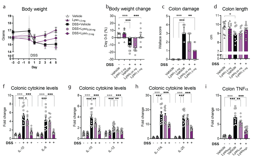為了進(jìn)一步研究補(bǔ)充溶菌酶對腸道健康的有益效果,本文中研究者們評估了化學(xué)誘導(dǎo)(DSS誘導(dǎo))的輕度結(jié)腸炎中的結(jié)腸損傷。設(shè)置了兩種劑量(1.0mg和0.4mg)的溶菌酶。在體重方面,發(fā)現(xiàn)接受1.0mg溶菌酶在對DSS誘導(dǎo)的小鼠的有一定的保護(hù)作用(圖3a-b),而0.04mg劑量的溶菌酶雖然缺乏保護(hù)作用,但是仍能抑制腸道炎癥(圖3c-h)。研究者還在所有測量數(shù)據(jù)中觀察到一個(gè)高度一致的劑量依賴性趨勢(圖3a-h)。與對照組小鼠相比,1.0mg溶菌酶沒有引起結(jié)腸損傷或細(xì)胞因子水平的可測量變化,因此表明溶菌酶不影響健康小鼠的免疫穩(wěn)態(tài)(圖3c-h)。
