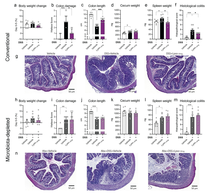 為了進(jìn)一步評估這種溶菌酶對腸道炎癥的療效,研究者接下來對DSS誘導(dǎo)的常規(guī)小鼠或微生物耗盡的BALB/c小鼠補(bǔ)充溶菌酶。
