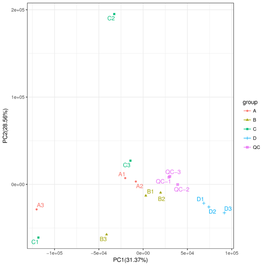 PCA圖現在用形狀和顏色區(qū)分更多的組,一眼就可看到組內和組間的代謝模式差別和聚類結果。同時顯示QC樣本,通過QC更能直觀的儀器的穩(wěn)定性。