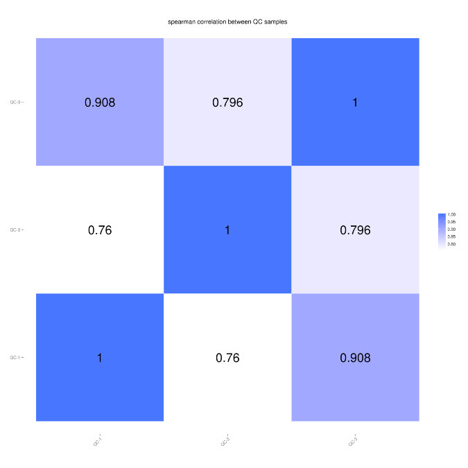 此外,新增QC樣本間的相關性, 通過計算QC樣品之間的相關性分析可以評估下機數據整體質量,一般認為QC樣本間相關性>0.75時,數據質量較為可靠。