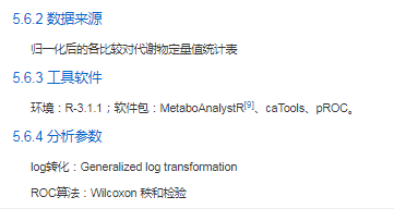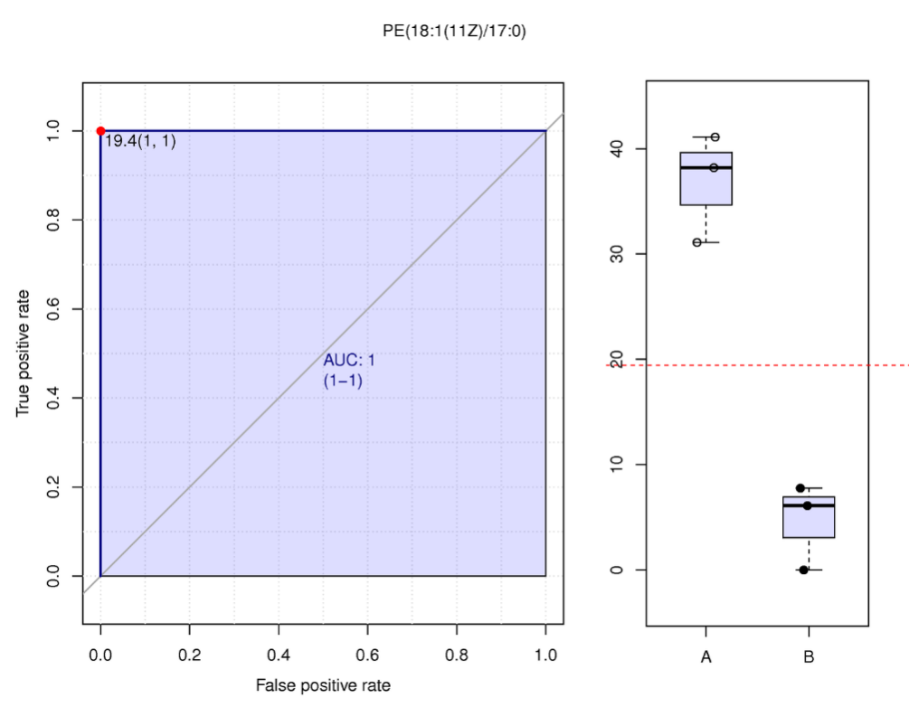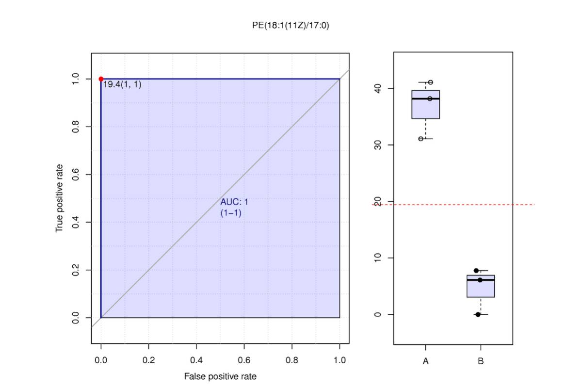 ROC曲線 (receiver operating characteristic curve) 是一種常用來篩選評估生物標記物的分析方法[9]。AUC (Area under the curve) 是衡量ROC曲線非常有用的度量。AUC始終在0.5(兩個類在統計上相同)和1.0(有一個閾值可以實現類之間的完美分離)之間,越接近1,物質的在對照組和實驗組的分離就越明顯(即為潛在的生物標記物)。一般來說,組內生物學重復>15時,ROC曲線才有足夠的點繪制折線,才會體現出較大意義。對篩選出的各組差異代謝物單獨進行ROC分析。