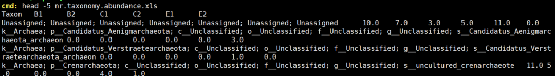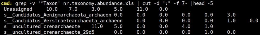 grep -v ‘^Taxon’ nr.taxonomy.abundance.xls | cut -d “;” -f 7- |head -5 #從中篩選種級(jí)別的注釋結(jié)果,并展示前5行。