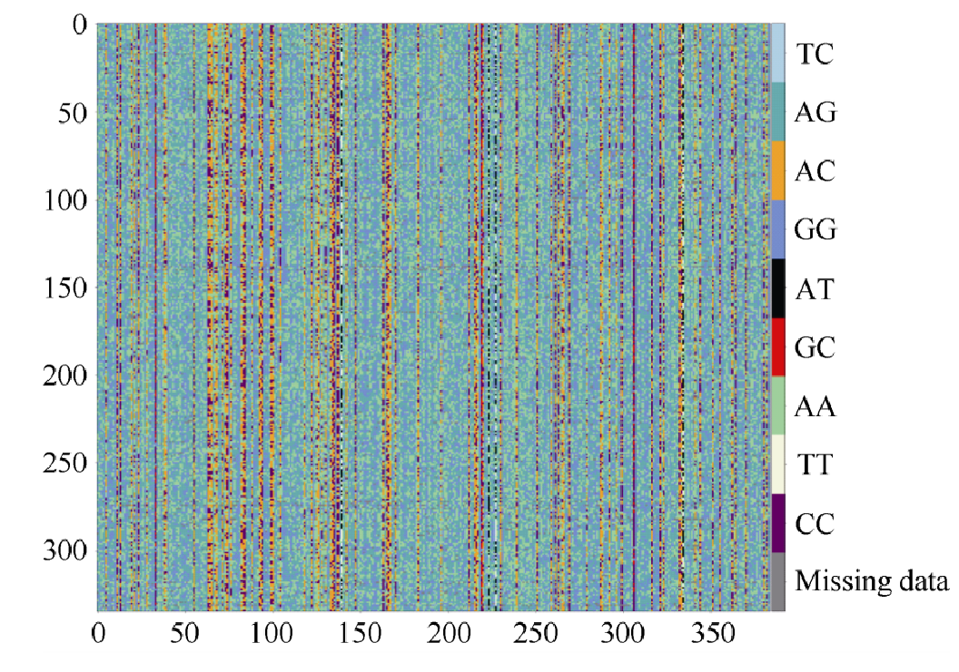 篩選適宜的核心標(biāo)記位點(diǎn),并將其用合適的形式展現(xiàn)出來(lái)至關(guān)重要。利用篩選得到的SNP標(biāo)記進(jìn)行品種材料的鑒定,并構(gòu)建DNA指紋圖譜。例如,玉米DNA指紋圖譜構(gòu)建研究中,利用384個(gè)?SNP?標(biāo)記組合構(gòu)建了?335?個(gè)玉米雜交種的基因型指紋圖譜,?該圖顯示每個(gè)品種的基因型組合均不同,?即?384?個(gè)?SNP?位點(diǎn)能夠有效區(qū)分所測(cè)試的雜交種。