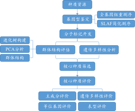 核心種質(zhì)可以最大限度地去除原始種質(zhì)資源中的重復(fù),以最少的種質(zhì)材料代表原始種質(zhì)資源的全部或大多數(shù)遺傳多樣性和地理來源,為當(dāng)前越來越多的種質(zhì)資源收集、評價和利用帶來了便利,特別是隨著基因組學(xué)的發(fā)展,測序成本的極速下降,使得大規(guī)模群體測序得以實現(xiàn)。利用高分辨率的分子標(biāo)記,提升遺傳材料間遺傳相似度和雜合度的鑒別能力,從而選擇能夠代表整個種質(zhì)資源基因多樣性的大小合理的核心種質(zhì)材料,更加有助于種質(zhì)資源的保存、管理、使用。使得我們可以有重點地進行優(yōu)異種質(zhì)的研究,結(jié)合GWAS分析、遺傳進化分析、QTL定位、特有標(biāo)記開發(fā)等方法進一步進行基因的挖掘與克隆,提高種質(zhì)資源的利用效率。