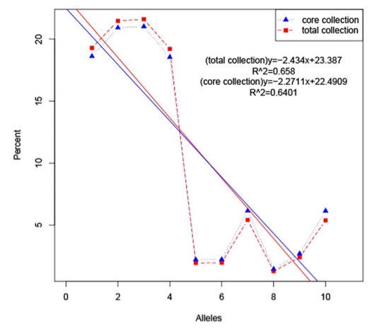 構(gòu)建好的核心種質(zhì)采用何種方法去評估核心樣品對整個種質(zhì)資源多樣性的代表性同樣是核心種質(zhì)研究中的重點。目前,大多數(shù)研究者結(jié)合不同的方法對核心種質(zhì)進行評估驗證,通過對原始種質(zhì)材料和篩選的核心種質(zhì)材料進行主成分分析,評估種質(zhì)篩選的準(zhǔn)確性,原則上,基于核心種質(zhì)繪制的主成分圖和所有材料的分布圖趨勢吻合,就能說明篩選結(jié)果的合理性;計算常規(guī)的遺傳多樣性指標(biāo):觀測雜合度(Observed?heterozygosity)、期望雜合度(Expected?heterozygosity)、Nei遺傳多樣性(Nei?diversity?index)、香濃維納多樣性指數(shù)(Shanon-Wiener?index)、多態(tài)性信息含量(PIC),對原始種質(zhì)材料以及篩選的核心種質(zhì)的遺傳多樣性進行評價;另外還包括等位基因評價和表型評價。