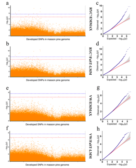 主要內(nèi)容:在本研究中,采用SLAF-seq技術(shù)對從中國廣東收集的149份馬尾松(Pinus?massoniana)材料進行測序,從599,164個多態(tài)性SLAF標(biāo)簽中鑒定了471,660個SNP標(biāo)記。群體結(jié)構(gòu)分析表明,149份馬尾松不能劃分成明顯的亞種群。使用遺傳距離和種群結(jié)構(gòu)來選擇核心種質(zhì),篩選出包含29個材料的核心種質(zhì),分別與樹脂產(chǎn)量和木材體積相關(guān)。對122份馬尾松材料進行關(guān)聯(lián)分析,包括不同高度(HT)、胸徑(DBH)、樹脂質(zhì)量(RW)、木材體積(VW)和樹脂產(chǎn)率(RYC),使用mrMLM、FASTmrMLM、FASTmrEMMA和ISIS?EM-BLASSO檢測到大量的SNP與性狀HT、DBH、RW和RYC顯著相關(guān)。馬尾松核心種質(zhì)為未來的改良育種提供寶貴的資源。