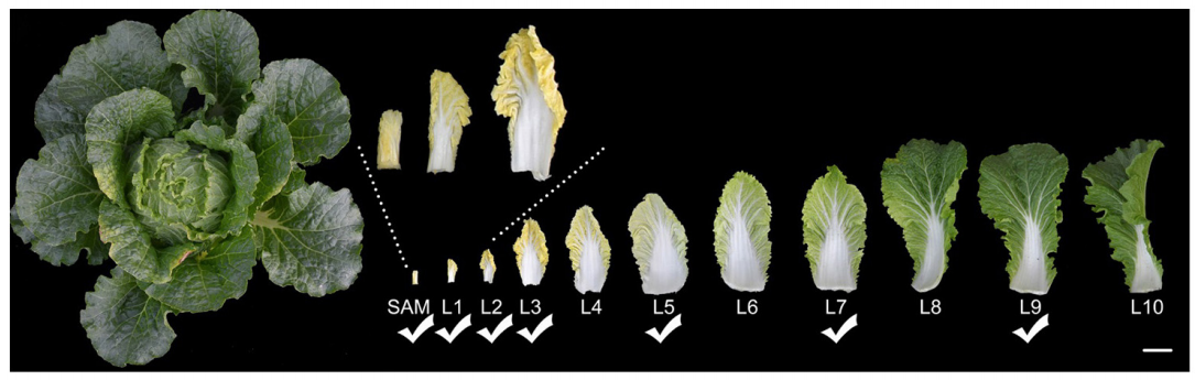 在溫室盆栽大白菜,使用11周大的植物進行取樣。隨機選擇兩個正常生長的大白菜。從外葉到內(nèi)葉的所有頭葉(葉長>2cm)按順序分離收集,而帶有莖尖分生組織(SAM)的幼葉和小內(nèi)葉(葉長<2cm)不分離,按順序收集。從每個大白菜頭部共得到30片葉子。從內(nèi)到外,每3片形態(tài)相似、大小相近的葉子為一葉輪,共得到10葉輪葉。