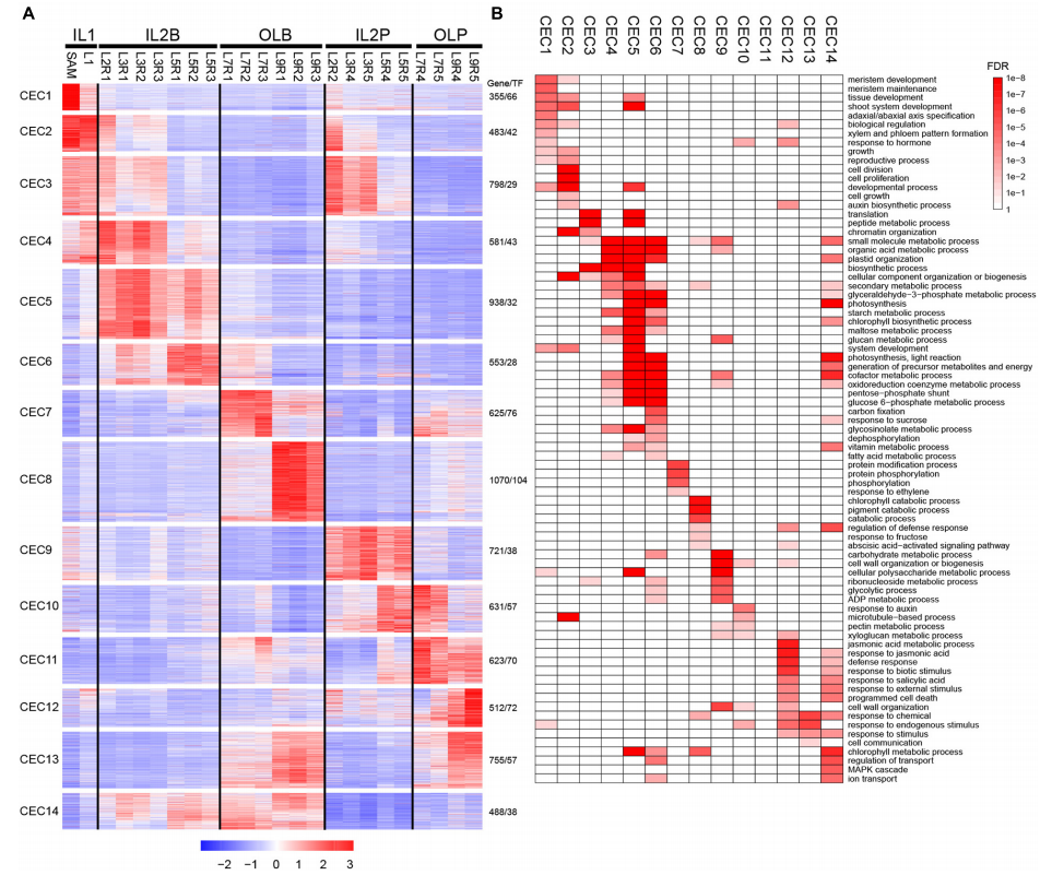 作者在全基因組水平上鑒定了不同葉片中的差異表達基因(DEG),以探索葉片之間的多樣性和潛在功能。通過分析,共發(fā)現(xiàn)9,133DEG,k-means聚類將差異基因分為14個共表達簇(CEC1-CEC14),這些CEC與圖1中的5個聚類簇緊密相關(guān)。IL1中DEGs的高表達水平以CEC1和2為代表。CEC1在SAM中高度表達,并以與分生組織發(fā)育、組織發(fā)育和近軸/遠軸極性相關(guān)的基因為代表。CEC2在SAM和L1高表達,包含與細胞分裂、細胞增殖、細胞生長和生長素生物合成過程相關(guān)的基因。IL2B中DEG的高表達水平以CEC4-6為代表。CEC4、5和6均富集于有機酸代謝過程、淀粉代謝過程、質(zhì)體組織和硫苷代謝、光合光反應(yīng)等過程。IL2P中DEGs的高表達以CEC9為代表。CEC9富含植物細胞壁相關(guān)過程,包括壁組織或生物發(fā)生,以及果膠代謝過程。OLB中DEGs以CEC7和8為代表。CEC7在L7葉片中高表達,并以與蛋白質(zhì)修飾過程、蛋白質(zhì)磷酸化和蛋白質(zhì)絲氨酸/蘇氨酸激酶活性相關(guān)的基因為代表。這些結(jié)果反映L7具有明顯的信號轉(zhuǎn)導(dǎo)和基因調(diào)控特征。CEC8在L9葉片中高表達,含有一組與葉綠素分解代謝過程、細胞分解代謝過程、防御反應(yīng)調(diào)節(jié)、果糖反應(yīng)和脫落酸激活信號通路相關(guān)的基因。OLP中DEG的高表達水平以CEC11和12為代表。CEC11中的基因在L7-L9的葉柄中高度表達,在任何基因本體(GO)術(shù)語中均未富集。CEC12中的基因在L9的葉柄中高度表達。這些基因可能主要參與脫落酸激活的信號通路、茉莉酸(JA)代謝過程、JA反應(yīng)、防御反應(yīng)、生物刺激反應(yīng)、水楊酸反應(yīng)和外部刺激反應(yīng)。這些結(jié)果表明,L9可能在保護多葉頭部免受外部損害方面發(fā)揮作用。