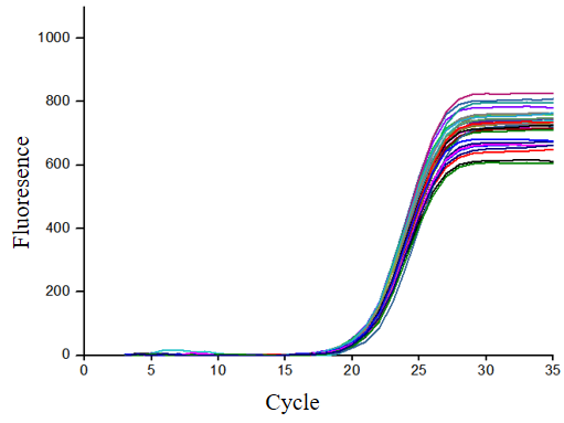 圖2:以100 ng小鼠肝臟總?RNA為模板,設置30個復孔,擴增β-actin基因,擴增重復率高。