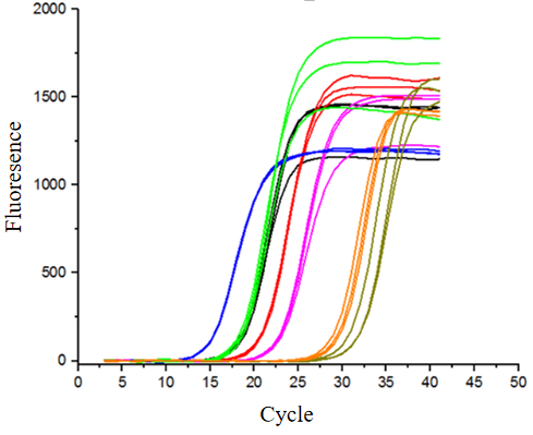 圖3:物種多樣性檢測:分別以不同物種、不同濃度的RNA為模板,進行一步法RT-qPCR擴增。包括人肝癌(藍色);果蠅(綠色);小鼠腸道(黑色);番茄果(紅色);日本水稻(紫色);辣椒(橙色);石斑魚(灰色)。