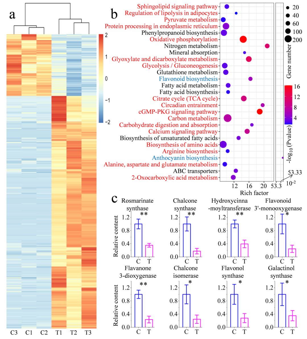 圖3?四環(huán)素改變轉錄組。a、差異轉錄本的熱圖聚類。b、差異轉錄本的KEGG。?圓越大,差異就越大。因子越高,富集程度越大。?紅色表示T中KEGG表達上調,藍色表示T中KEGG表達下調(P?<?0.05,上調或下調80%以上)。c、受四環(huán)素影響的代謝途徑相關轉錄本的例子。