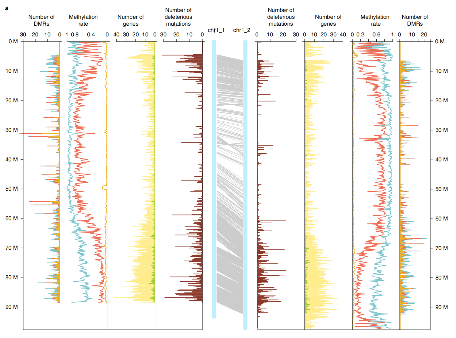 ① ?除了常規(guī)基因組中甲基化的修飾,大多數(shù)二倍體基因組組裝都忽略了同源染色體之間的差異,將基因組組裝成一個假的單倍體序列,但隨著研究的深入,發(fā)現(xiàn)僅單套的基因組數(shù)據(jù)難以完全演示高雜合物種的全面信息。同源染色體之間不同遺傳位點的組合對生物表型有重要影響,如動植物中的雜種優(yōu)勢、某些物種雜交不育現(xiàn)象等。單倍型等位基因間差異對基因表達、功能及其表型都有著重要影響,大多數(shù)雜交品種的優(yōu)勢表型都受等位基因調(diào)控。二倍體馬鈴薯(Zhou Q et al., Nature Genetics.2020)、蘋果(Sun X P et al.,Nature Genetics.2020)、鐵觀音(Zhang X et al., Nature Genetics.2021)等單體型基因組的案例給我們成功展示了高雜合度的二倍體同源組間有不對稱演化的現(xiàn)象,即某套單倍型上保留較高的基因表達水平、維持較低的甲基化水平、經(jīng)歷較強的純化選擇(負選擇)等。