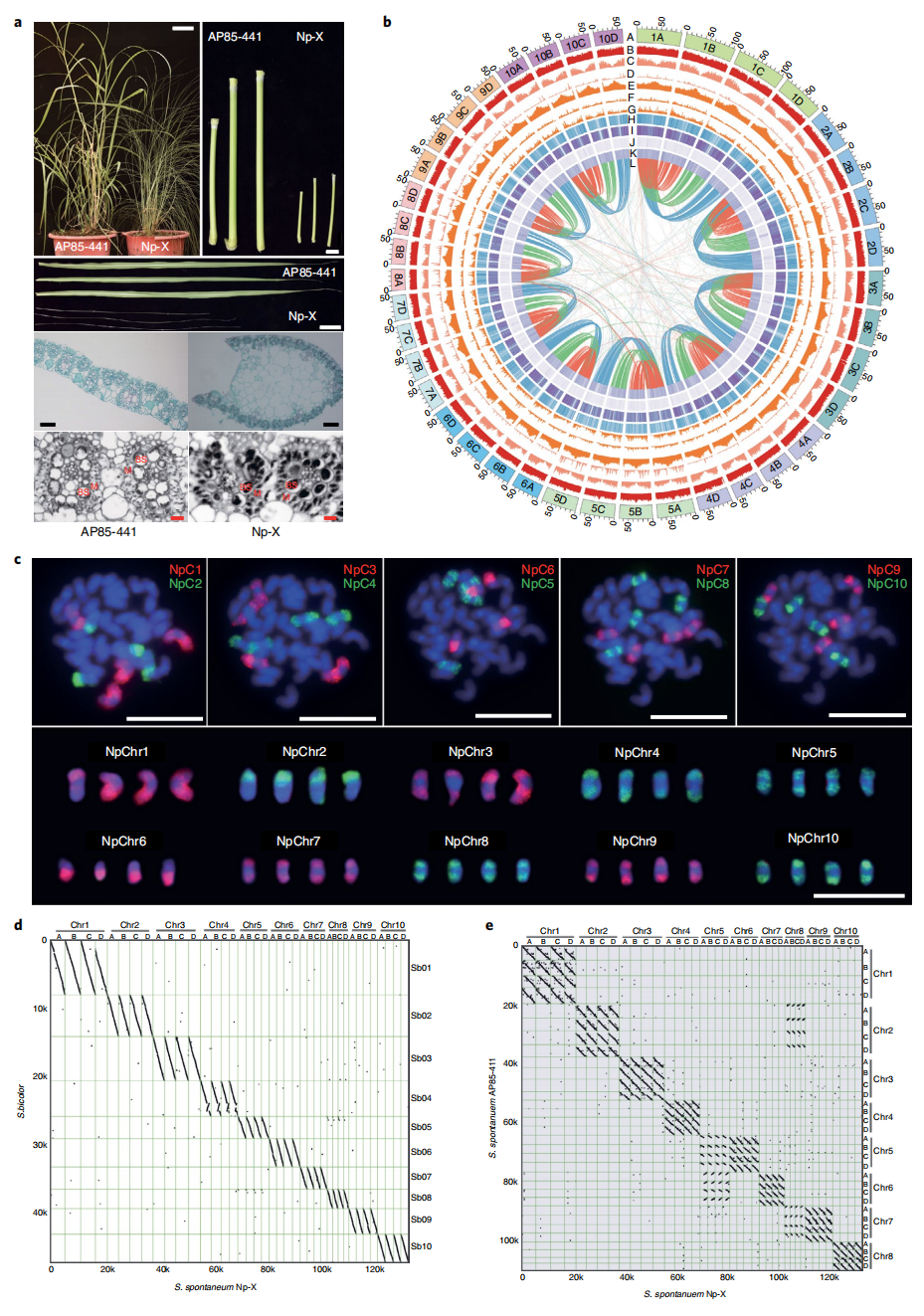 甘蔗屬是具有重要經(jīng)濟(jì)價(jià)值的作物,但其遺傳背景極其復(fù)雜,限制了甘蔗的進(jìn)一步育種改良。具有廣泛分布的甘蔗細(xì)莖野生種割手密(S. spontaneum)為現(xiàn)代栽培種甘蔗貢獻(xiàn)了抗逆、分蘗等優(yōu)良性狀,實(shí)現(xiàn)了甘蔗的育種史上大的突破。割手密倍性和染色體基數(shù)的廣泛變異是甘蔗育種重要的種質(zhì)資源,為研究植物同源多倍體基因組的進(jìn)化提供了一個(gè)良好的模型。如何將天然同源四倍體的四套同源基因組完整組裝?不同倍性與染色體基數(shù)如何演化?這都是甘蔗基因組研究有趣和重要的地方也是難以攻破之處。本次研究在構(gòu)建高質(zhì)量基因組的基礎(chǔ)上進(jìn)一步解析了甘蔗復(fù)雜的演化之路:(1)本次研究完成了割手密 Np-X(2n=4x=40)高質(zhì)量同源多倍體基因組測(cè)序,完整的組裝了10組同源染色體的共40條染色體基因組。(2)Saccharum中的一對(duì)古復(fù)制染色體NpChr5和NpChr8經(jīng)歷了分裂,隨后融合并伴隨著著絲粒分裂。重組時(shí)帶有著絲粒結(jié)構(gòu)的染色體片段融合入另外一條完整的染色體,導(dǎo)致x = 8中出現(xiàn)“雙著絲?!爆F(xiàn)象。(3)甘蔗分別在6.4 Mya和4.0 Mya時(shí)與高粱和芒草發(fā)生分化。在甘蔗中,割手密與S. officinarum在~1.6 Mya發(fā)生分化,兩個(gè)割手密材料Np-X(x=10)和AP85-441(x=8)在~0.8 Mya分化,表明AP85-441中的染色體減少是最近發(fā)生的。比較基因組結(jié)合轉(zhuǎn)錄組共同解析兩個(gè)甘蔗種“近期”獨(dú)立分化的且與糖分代謝、生物量、光合等相關(guān)的基因,為甘蔗的分子輔助育種提供重要的理論指導(dǎo)。(4)研究推斷Np-X(x=10)有可能代表祖先的核型,核型x=9和x=8可能是以逐步方式進(jìn)化而來(lái)。割手密起源于印度北部的一個(gè)x=10的祖先,然后傳播到印度次大陸、中國(guó)和東南亞的四個(gè)主要群體。在染色體減少過(guò)程中,基因組中受自然選擇區(qū)可能參與多糖代謝和脅迫耐受過(guò)程。
