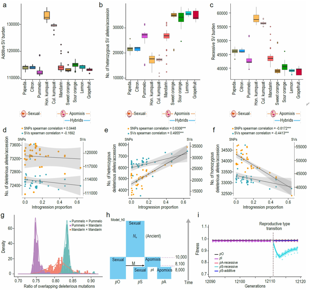 柑橘通過珠心進行無融合生殖,保留了母體基因型,這可能導(dǎo)致基因組中有害突變和結(jié)構(gòu)變異(SVs)的積累。從234份材料中共鑒定出139,241個可靠的SVs,其中64.2%為缺失,16.6%為重復(fù),15.5%為易位。山金柑的SV數(shù)量最高,可能與有效種群大小減少有關(guān)(圖3a)。具有無融合生殖的雜交群體的雜合有害變異約為有性生殖群體的1.45倍。隨后提出了雜種無融合生殖將SVs隱藏在雜合子狀態(tài)的假說,這可能主要是隱性選擇造成的危害。因此,有性生殖的雜種可能會迅速以隱性純合的方式暴露有害變異。這個假說解釋了為什么無融合生殖和有性生殖的天然雜交樣本中觀察到的自然雜種通常是無融合生殖的。有害突變的模式與SVs的模式一致,即與有性生殖群體相比,無融合生殖群體的隱性有害負擔(dān)較低(7.39%),雜合子SVs較多(約2.62倍)。在隱性模型下,從無融合生殖到有性生殖的生殖模式轉(zhuǎn)變導(dǎo)致種群適應(yīng)度在轉(zhuǎn)變后立即下降13.48±0.87%,但隨后恢復(fù)(圖3i)。相比之下,保持無融合生殖的種群保持種群適合度。