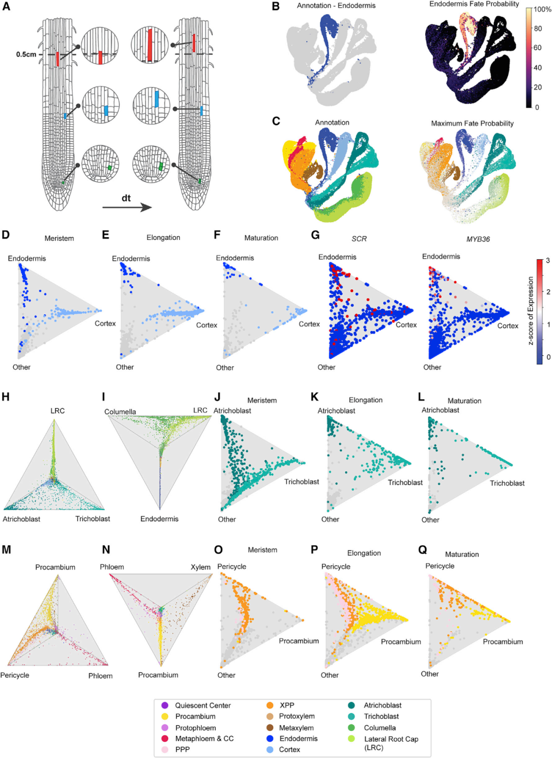 由于擬時序推理表明根細胞類型以不同的速率成熟,于是作者利用基于理想傳輸理論OT(Optimal?Transport)的StationaryOT分析方法來推斷整個圖譜的發(fā)育軌跡。研究人員發(fā)現(xiàn)它可以在很大程度上獨立于圖譜注釋和細胞系分割,來推斷細胞系的發(fā)育軌跡,反映每種細胞和組織類型分化的現(xiàn)有生物學知識。分化事件可以通過將多個命運概率以“三角圖”的形式投影到重心坐標中來實現(xiàn)可視化。作者利用“三角圖”分別展現(xiàn)了分生區(qū)、伸長區(qū)、成熟區(qū)的內(nèi)皮層和皮層細胞的命運概率(圖4D-F)。已知內(nèi)皮層標記基因SCARECROW?(SCR)?和MYB36的表達模式與伴隨細胞成熟而不斷增加的內(nèi)皮層命運概率相一致(圖4G)。之后按照發(fā)育區(qū)對生毛細胞、非生毛細胞(圖4J-L),中柱鞘、原形成層(圖4O-Q)也繪制“三角圖”。此外,理想傳輸理論也有助于識別發(fā)育調(diào)節(jié)因子。