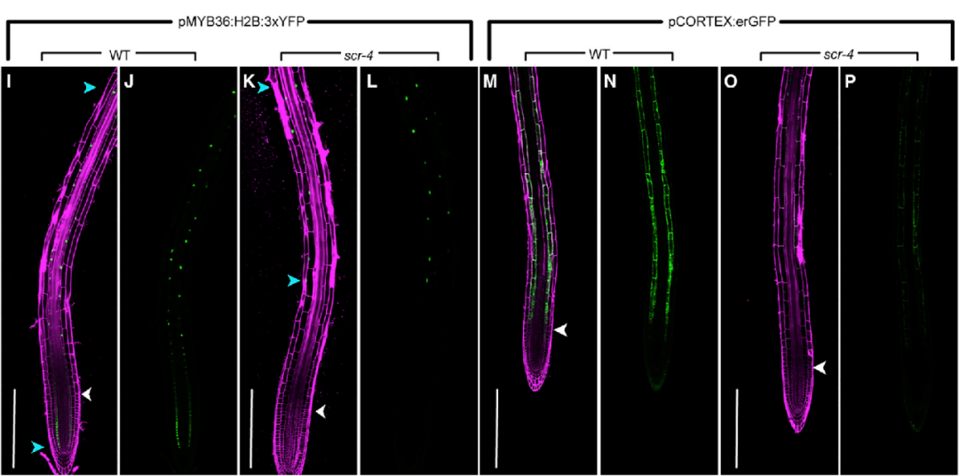 為了在體內(nèi)進一步對scRNA-seq得到的結(jié)論進行驗證,作者驗證了皮層和內(nèi)皮層標志物的空間表達模式在scr突變層是否會發(fā)生改變。在WT中,內(nèi)皮層標志基因MYB36和皮層轉(zhuǎn)錄報告基因AT1G09750?(CORTEX)在它們各自類型的伸長區(qū)表達,MYB36在分生區(qū)的內(nèi)皮層也表達。但scr突變體中,MYB36轉(zhuǎn)錄報告基因的表達僅在晚期延伸區(qū)和成熟區(qū)可見,皮層轉(zhuǎn)錄報告基因在延伸區(qū)和成熟區(qū)都有所減少(圖6-2)。以上結(jié)果都與scRNA-seq分析結(jié)果一致。