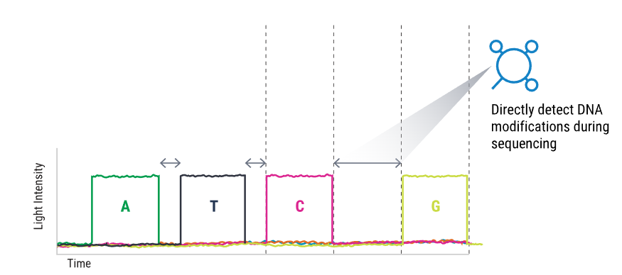 PacBio平臺(tái)主要通過(guò)DNA聚合酶與模板鏈結(jié)合,在鏈合成的過(guò)程中,不同熒光標(biāo)記的堿基會(huì)釋放不同的熒光信號(hào),根據(jù)光的波長(zhǎng)與峰值從而判斷堿基類(lèi)型與順序。聚合酶合成中每個(gè)堿基間都存在時(shí)間間隔,當(dāng)模板堿基有修飾時(shí),兩個(gè)相鄰的脈沖峰之間的距離就會(huì)延長(zhǎng)。當(dāng)IPD比例(兩個(gè)相鄰的脈沖峰之間的距離和參考序列距離的比值)明顯大于1 時(shí),可推斷這個(gè)位置存在修飾。