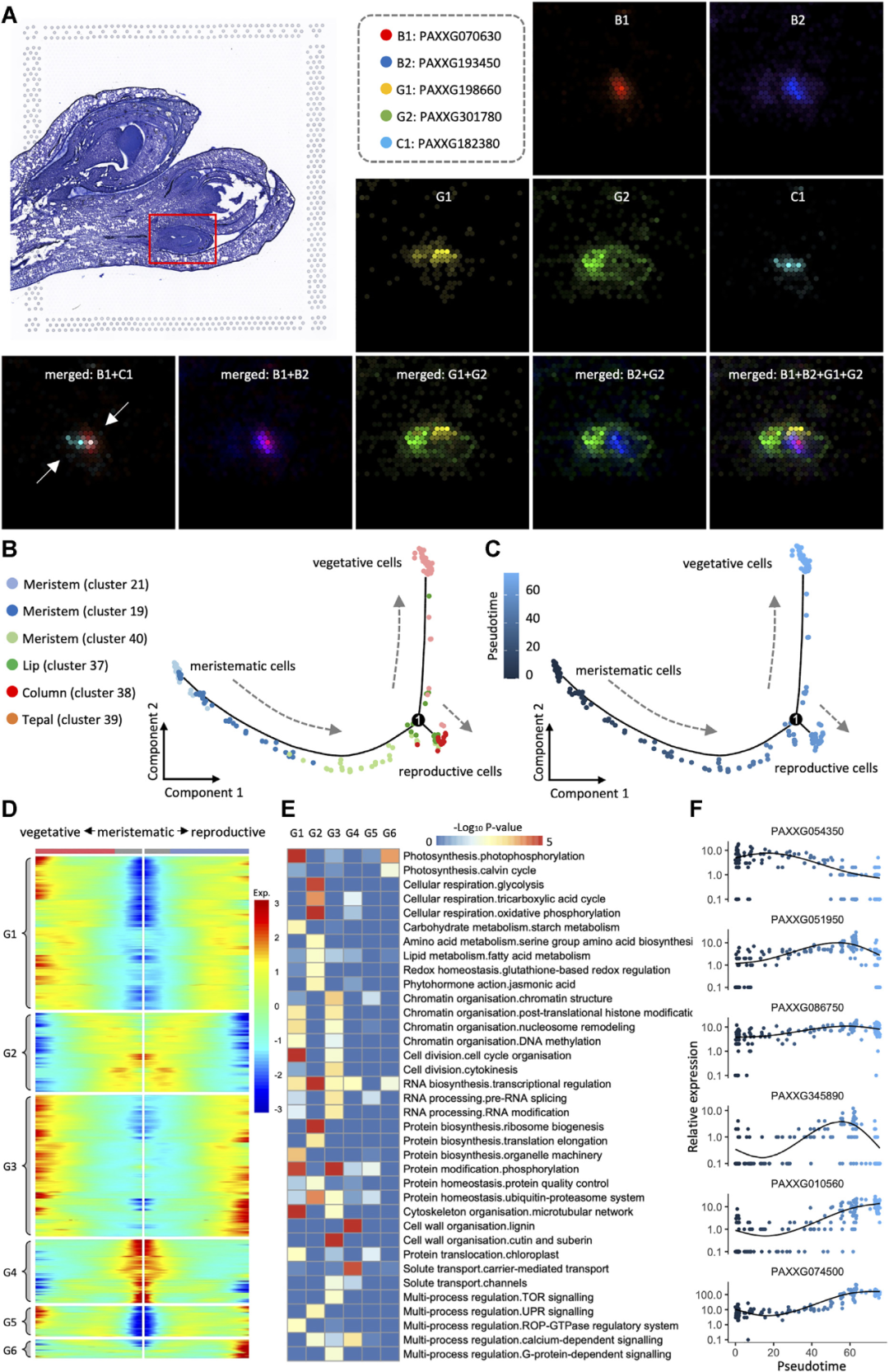 為了研究從分生組織細(xì)胞到營(yíng)養(yǎng)型細(xì)胞(花被、唇瓣)和生殖細(xì)胞(花柱)的分化,研究團(tuán)隊(duì)用Monocle繪制了細(xì)胞狀態(tài)的軌跡。如圖2B所示,三簇分生組織細(xì)胞形成了一條連續(xù)的路徑,代表其發(fā)育過(guò)程,與其在組織學(xué)切片上的位置高度一致。該路徑分為兩條子路徑:一條是由花被片中的營(yíng)養(yǎng)型細(xì)胞組成,另一條由花柱中的花藥原基生殖細(xì)胞組成。細(xì)胞類(lèi)型變化的軌跡作為動(dòng)態(tài)發(fā)育過(guò)程的靜態(tài)投影,也可以理解為分生組織細(xì)胞的擬時(shí)序分化。如圖2C所示,此時(shí)營(yíng)養(yǎng)型細(xì)胞出現(xiàn)較早,并分散在子路徑的遠(yuǎn)端。共鑒定出4,685個(gè)空間差異基因與發(fā)育擬時(shí)間相關(guān),對(duì)這些基因繪制分支軌跡基因表達(dá)熱圖,發(fā)現(xiàn)它們隨著發(fā)育路徑的分離表現(xiàn)出不同的表達(dá)模式(圖2D)。MapMan功能富集圖顯示它們主要富集在細(xì)胞壁代謝、激素、脂質(zhì)、蛋白質(zhì)和RNA合成等功能上(圖2E)。通過(guò)基因的擬時(shí)分布圖發(fā)現(xiàn)許多其他基因可能在分生組織、營(yíng)養(yǎng)組織和生殖組織的細(xì)胞分化過(guò)程中發(fā)揮作用(圖2F)。