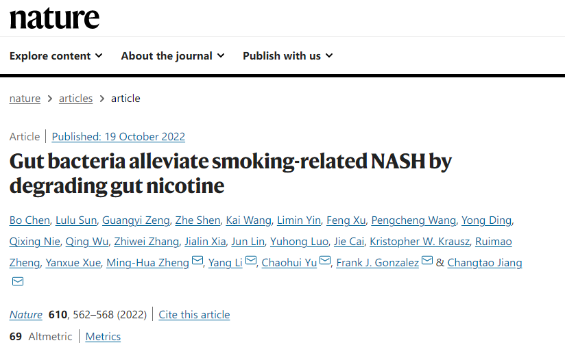2022年10月19日,北京大學(xué)醫(yī)學(xué)部姜長濤團(tuán)隊(duì)聯(lián)合美國國立衛(wèi)生研究院、浙江大學(xué)醫(yī)學(xué)院、復(fù)旦大學(xué)基礎(chǔ)醫(yī)學(xué)院和溫州醫(yī)科大學(xué)的研究團(tuán)隊(duì)在國際期刊《Nature》雜志在線發(fā)表了題為“Gut bacteria alleviate smoking-related NASH by degrading gut nicotine”的重磅研究。該研究解析了腸道尼古丁積累在非酒精性脂肪性肝炎進(jìn)展中的作用,發(fā)現(xiàn)了人類腸道中一種能夠代謝尼古丁的內(nèi)源性細(xì)菌,并提出了一種可能的減少吸煙加劇NAFLD進(jìn)展的途徑。百邁客為該研究提供了宏基因組測序服務(wù)。
