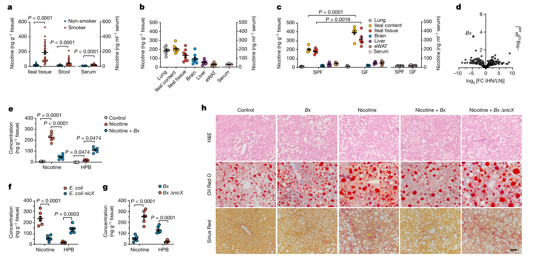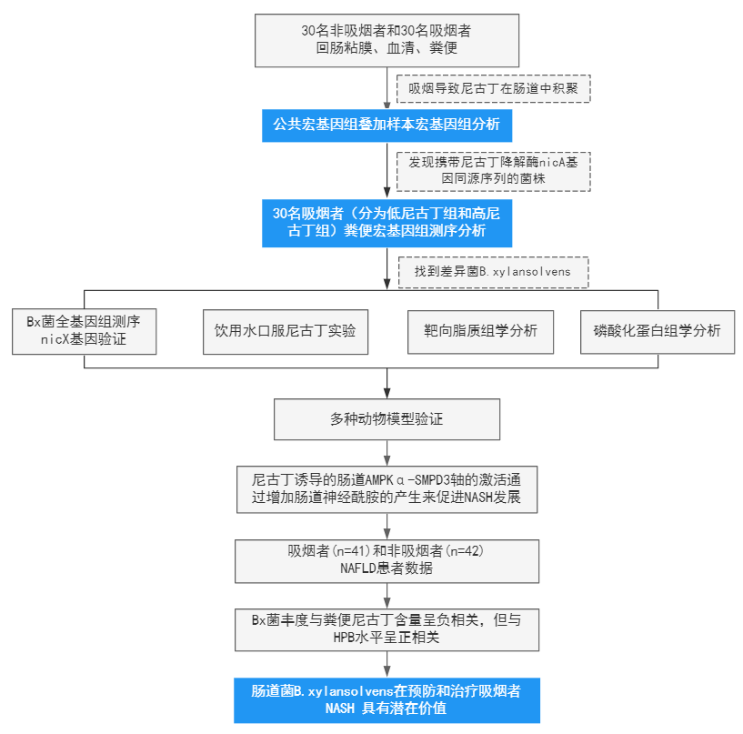 該研究發(fā)現(xiàn)尼古丁在吸煙期間在腸道中積聚并加速NAFLD的進(jìn)展,但它可以被人類共生菌B. xylanisolvens 有效降解。揭示了了腸道尼古丁積累的病理影響,并確定了一種內(nèi)源性尼古丁降解腸道細(xì)菌,該細(xì)菌對預(yù)防和治療吸煙者的 NASH 具有潛在價(jià)值。