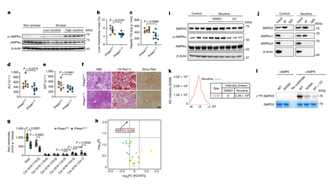 脂質(zhì)被認(rèn)為在 NAFLD 進(jìn)展中具有重要作用,因?yàn)樗鼈兪窃摬±韺W(xué)中腸道和肝臟之間串?dāng)_的關(guān)鍵介質(zhì)。研究者進(jìn)一步對回腸進(jìn)行了靶向脂質(zhì)組學(xué)分析,并確定神經(jīng)酰胺是導(dǎo)致Prkaa1基因敲除(KO)和對照(WT)腸上皮在尼古丁治療下基于聚集分化的主要代謝物(擴(kuò)展數(shù)據(jù)圖5n,o)。在尼古丁飲用模型中沒有腸道 AMPKα1 的情況下,回腸神經(jīng)酰胺譜較低(圖 2g)?;谀峁哦★嬘媚P突啬c上皮的磷酸化蛋白質(zhì)組分析(擴(kuò)展數(shù)據(jù)圖 5p),腸上皮AMPKα1的缺失顯著降低了SMPD3的Ser208位的磷酸化(圖2H和擴(kuò)展數(shù)據(jù)圖5Q)。