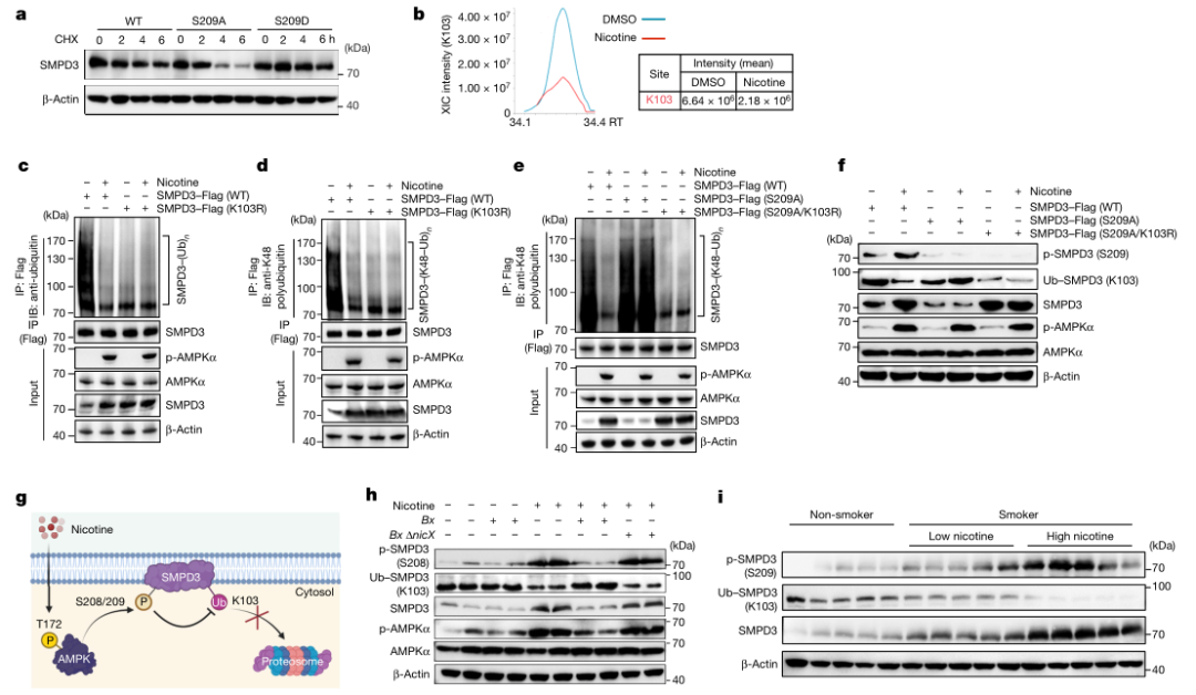 此外,在尼古丁處理的SW480細(xì)胞中,SMPD3在Lys103處的去泛素化程度顯著高于DMSO處理的細(xì)胞(圖3B和擴(kuò)展數(shù)據(jù)圖6G)。通過免疫沉淀,我們發(fā)現(xiàn)泛素化的SMPD3(Lys103)主要包含經(jīng)典的Lys48-連接Ub鏈(Lys48-Ub),而不是Lys63-Ub,后者被尼古丁處理減少(圖3C,d和擴(kuò)展數(shù)據(jù)圖6h)。S209A突變逆轉(zhuǎn)了尼古丁誘導(dǎo)的SMPD3 Lys48-Ub的減少,K103R突變進(jìn)一步緩解了這一下降(圖3e和擴(kuò)展數(shù)據(jù)圖6i)。此外,開發(fā)了抗p-SPMD3(S209)和抗Ub-SMPD3(Lys103)抗體(擴(kuò)展數(shù)據(jù)圖6J,k),并證實(shí)尼古丁誘導(dǎo)的總SMPD3蛋白的增加是由于SMPD3磷酸化水平升高,隨后泛素化減少(圖3F)。