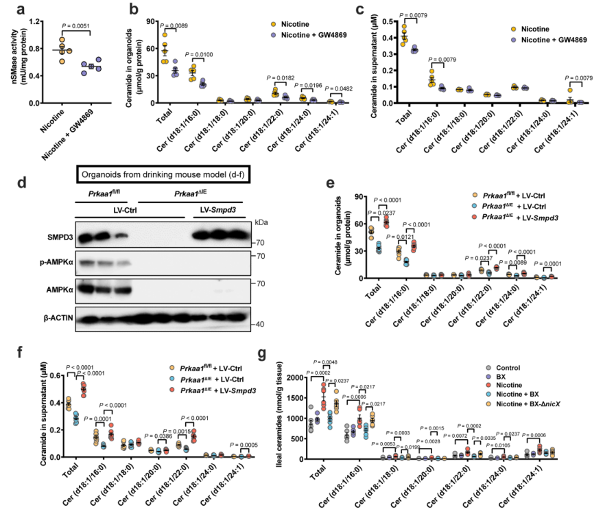 SMPD3被認(rèn)為是代謝性疾病的病理加速器。將SMPD3抑制劑GW4869應(yīng)用于有機(jī)化合物以抑制SMPD3活性。GW4869降低了尼古丁處理下類器官及其上清液中的神經(jīng)酰胺水平。慢病毒表達(dá)的SMPD3被用于從尼古丁飲用模型恢復(fù)Prkaa1基因敲除的回腸器官中SMPD3的表達(dá)。正如預(yù)期的那樣,SMPD3的過表達(dá)逆轉(zhuǎn)了由于回腸器官中AMPKα1缺乏而導(dǎo)致的神經(jīng)酰胺水平的降低。在尼古丁加速的NASH小鼠模型中,在B. xylanisolvens存在的情況下,被B.xylansolvens定植的SPF小鼠回腸神經(jīng)酰胺減少,這是由于腸道p-AMPKα-SMPD3軸被抑制所致。