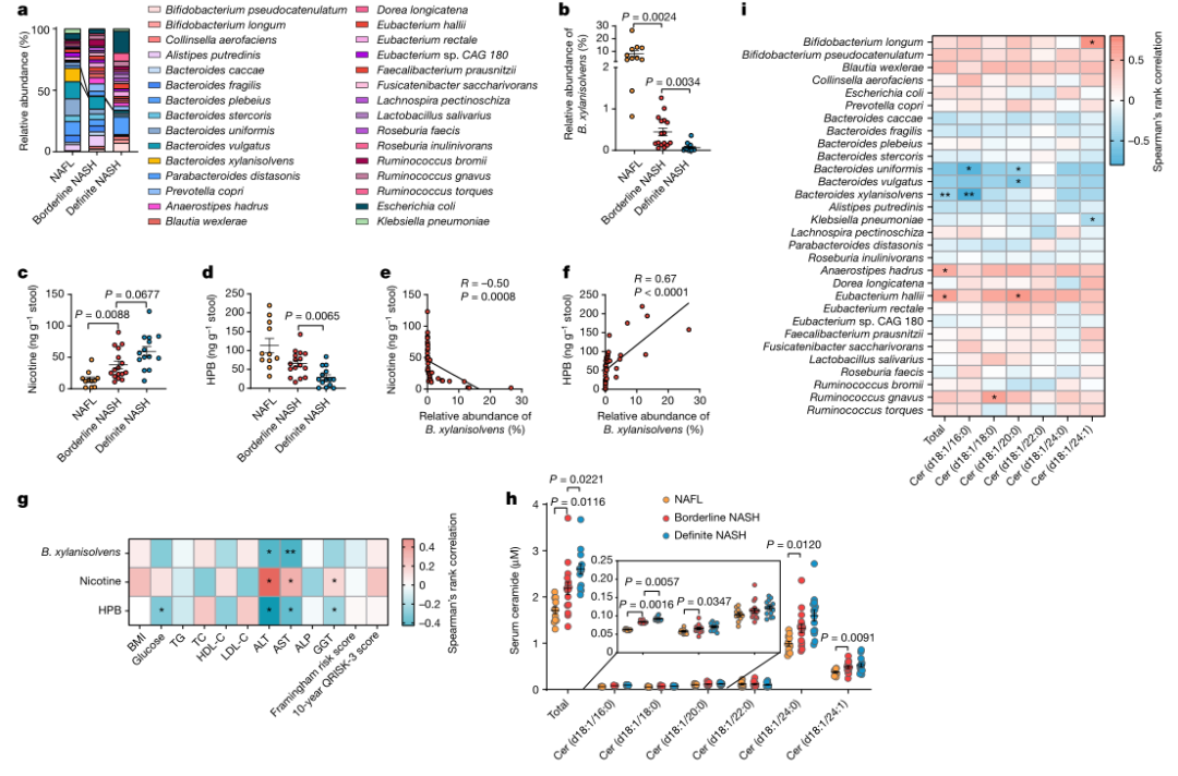 為了闡明我們的發(fā)現(xiàn)與人類NAFLD進(jìn)展之間的相關(guān)性,我們收集了83名經(jīng)活檢證實(shí)的NAFLD患者的數(shù)據(jù),這些患者被分為吸煙者(n=41)和非吸煙者(n=42)。在吸煙者中,NAFL、Borderline NASH和Defined NASH在煙草吸煙史(包括吸煙年限和每天吸煙數(shù)量)方面沒有顯著差異。然而,我們發(fā)現(xiàn)B.xylansolvens水平與NAFLD嚴(yán)重程度呈負(fù)相關(guān),隨著NAFLD的進(jìn)展,糞便中尼古丁水平逐漸增加,糞便中尼古丁降解產(chǎn)物HPB相應(yīng)地隨著NAFLD的進(jìn)展而減少(圖4C,d)。在吸煙者中,B.xylansolvens豐度與糞便尼古丁含量呈負(fù)相關(guān),但與HPB水平呈正相關(guān)(圖4e,f)。