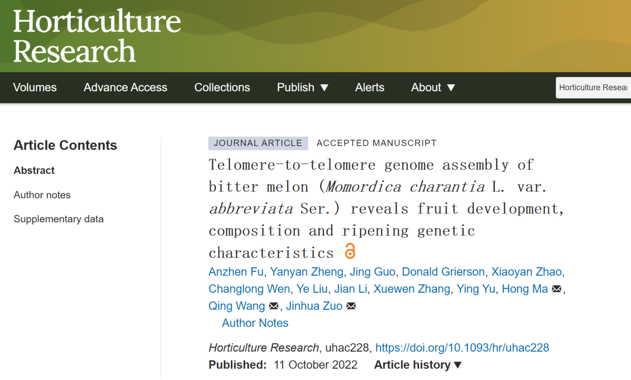 近日,北京市農(nóng)林科學院農(nóng)產(chǎn)品加工與食品營養(yǎng)研究所左進華研究員團隊聯(lián)合美國賓夕法尼亞州立大學馬紅教授團隊完成超高質(zhì)量苦瓜變種‘金鈴子’T2T基因組。主要研究成果“Telomere-to-telomere genome assembly of bitter melon (Momordica charantia L. var.?abbreviata Ser.) reveals fruit development, composition and ripening genetic characteristics”在線發(fā)表于園藝TOP期刊Horticulture Research。該研究揭示了‘金鈴子’基因組組成和進化關(guān)系以及果實生長發(fā)育的分子調(diào)控機制,進一步細化了苦瓜亞種材料差異表型的基因組變異特征,以及果實品質(zhì)的關(guān)鍵信息。本研究是該團隊在葫蘆科領(lǐng)域的完成的第3個高質(zhì)量基因組,為葫蘆科系統(tǒng)發(fā)育與應(yīng)用研究起到了重要的推動作用。百邁客張學雯、余瑩作為共同作者,參與了本項研究。