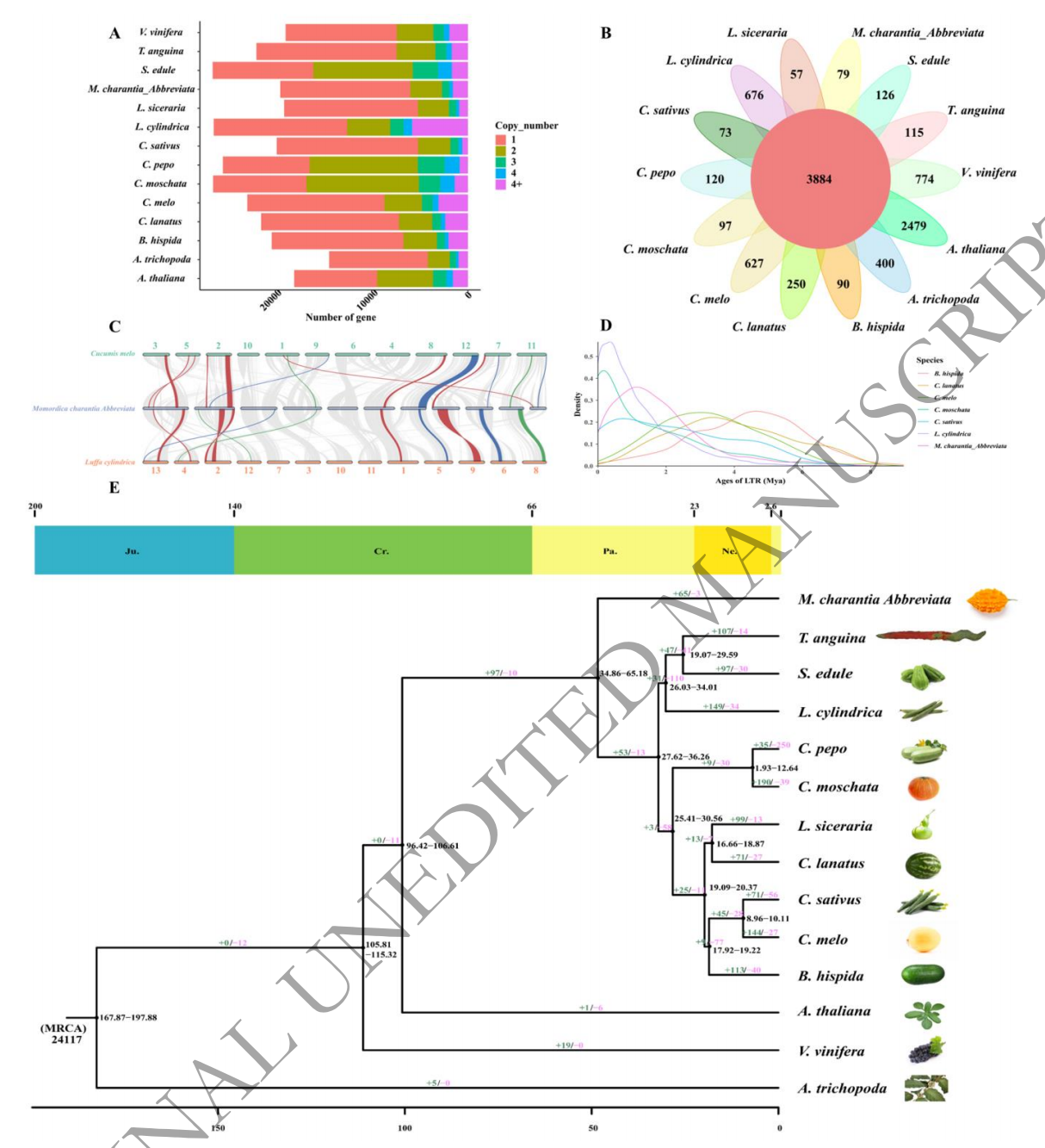 研究顯示,苦瓜在115.08-120.42 Mya時從其他近緣種中分化出來,0.53-52.49 Mya金鈴子與苦瓜發(fā)生分化。共線性分析顯示,在甜瓜、絲瓜、‘金鈴子’中檢測到了在馴化過程中對果實成熟和風味形成起作用的幾個共線基因,主要參與植物激素信號轉(zhuǎn)導、葫蘆素和類胡蘿卜素合成途徑。