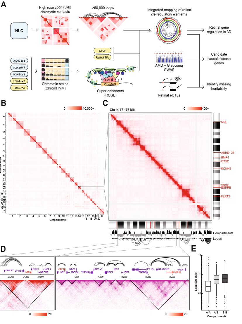 在過(guò)去視網(wǎng)膜疾病的全基因組關(guān)聯(lián)研究(GWAS)發(fā)現(xiàn)常見(jiàn)的變異主要在基因組非編碼區(qū)域,但由于先導(dǎo)變異區(qū)域的局部連鎖不平衡(LD),阻礙了特定關(guān)聯(lián)基因和變異的識(shí)別,因此闡明與性狀相關(guān)的遺傳變異如何影響調(diào)節(jié)基因表達(dá)網(wǎng)絡(luò),并因此影響表型,亟需了解相關(guān)組織和細(xì)胞類(lèi)型的3D基因組拓?fù)浣Y(jié)構(gòu)。